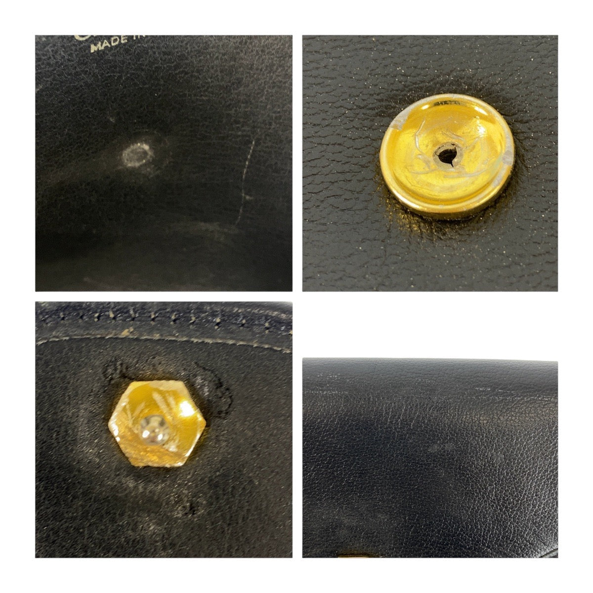 Hardware: Gold-tone parts show scratches and finish wear; push-lock shows plating wear from use.