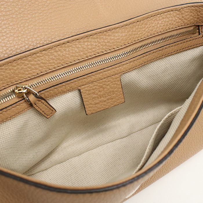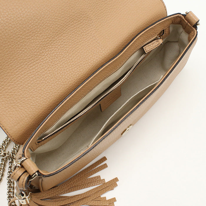 - Color/Material: Beige leather with gold hardware
